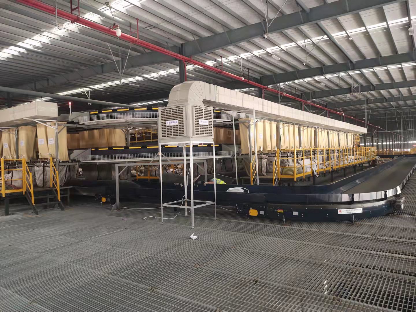 百世集團廣州番禺分撥是一家大型物流運轉中心,場地面積50000平方,倉庫主體是鋼結構,廣州夏季溫度高倉儲運轉設備發熱多等特點,夏季庫房溫度達到40度左右,分揀員工無法正常工作,有可能發生意外和中暑,我公司工程師經過現場勘查,設計50臺夏瑞22型冷風機,加裝管道采取定點崗位送風,另外配XR-730型工業大吊扇,安裝后室內溫度達到30度左右,通過大風扇把涼爽空氣送到每個角路,大大的改善了工作環境,受到領導和員工一直好評。