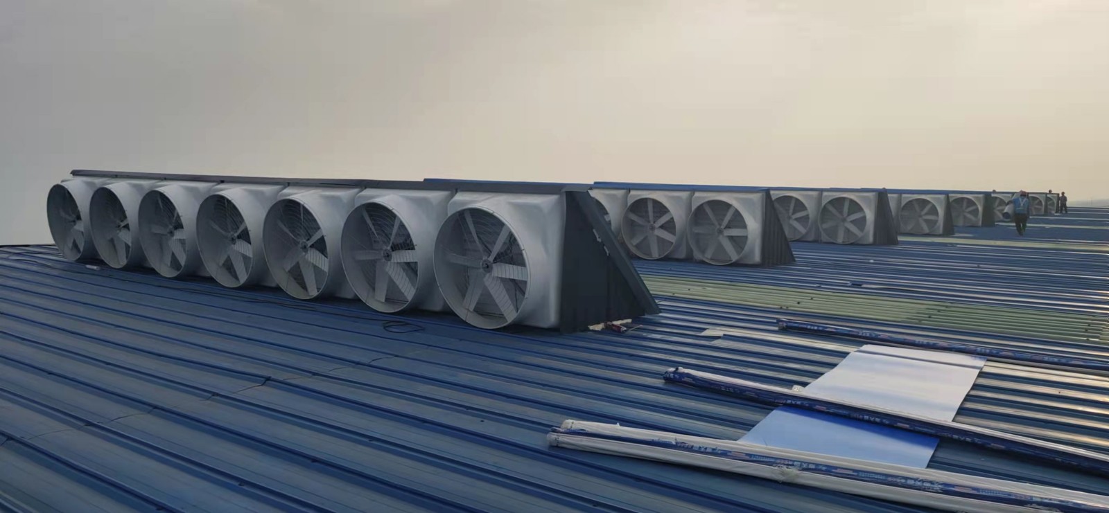 我公司為金泰包裝改造連退新車間通風降溫,連退車間高36米寬18米長200米,整個車間連退設備發熱量大設備多,設備高30米,高處維修平臺正常溫度達到55到60度,極端天氣能達到65度,工人上去幾分鐘就中暑,我公司設計1460型玻璃鋼負壓風機60臺向外排熱氣,在廠房兩次安裝20臺22型濕簾冷風機往車間送大量冷風,設備安裝運行以后車間溫度降到40度左右,極大的改善了工作環境。